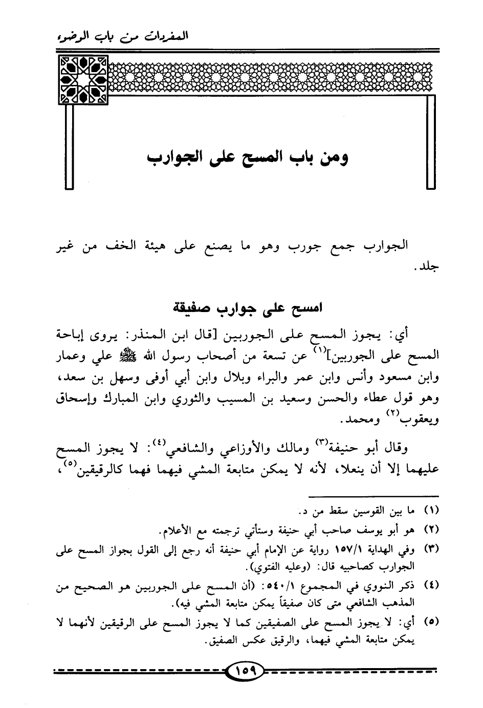 (¬3) وفي الهداية 1/ 157 رواية عن الإمام أبي حنيفة أنه رجع إلى القول بجواز المسح على الجوارب كصاحبيه قال: (وعليه الفتوي).