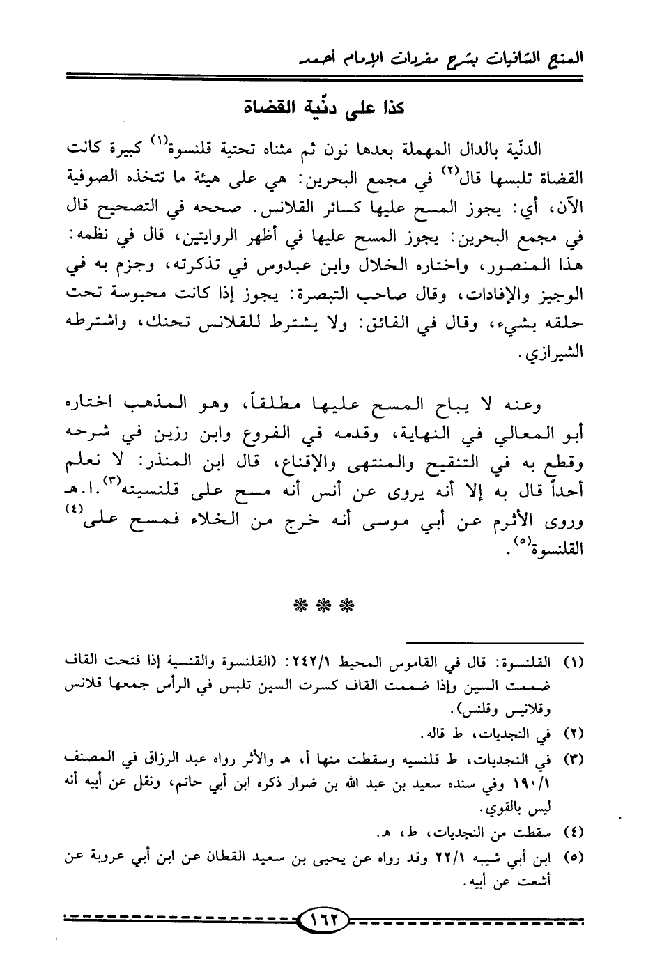 (¬3) في النجديات، ط قلنسيه وسقطت منها أ، هـ والأثر رواه عبد الرزاق في المصنف 1/ 190 وفي سنده سعيد بن عبد الله بن ضرار ذكره ابن أبي حاتم، ونقل عن أبيه أنه ليس بالقوي.