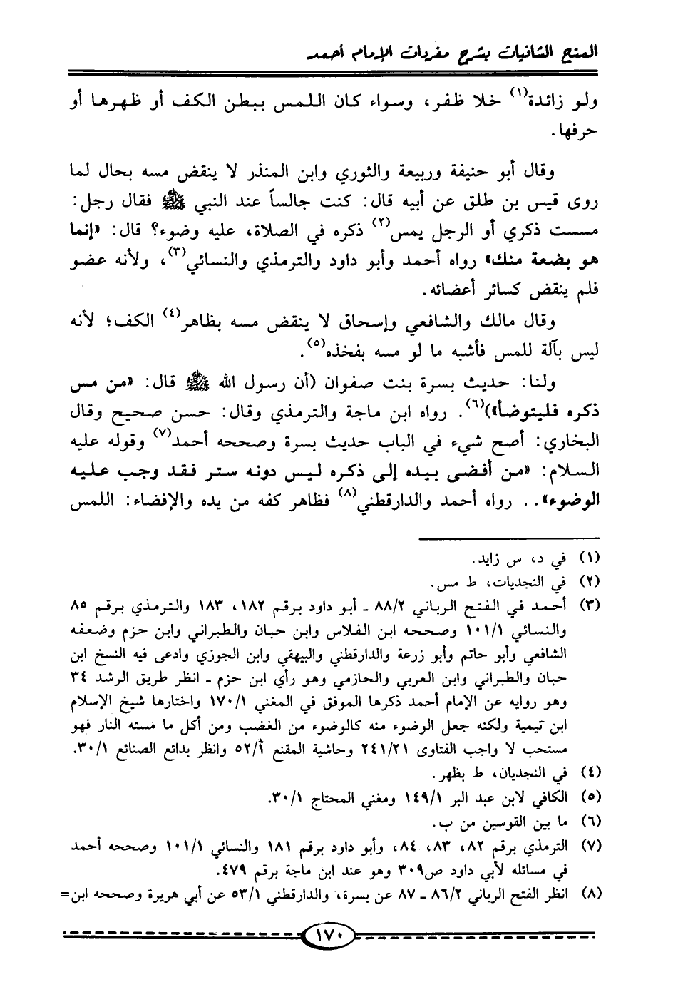 (¬3) أحمد في الفتح الرباني 2/ 88 - أبو داود برقم 182، 183 والترمذيُّ برقم 85 والنسائيُّ 1/ 101 وصححه ابن الفلاس وابن حبان والطبرانيُّ وابن حزم وضعفه الشافعي وأبو حاتم وأبو زرعة والدارقطنيُّ والبيهقيُّ وابن الجوزي وادعى فيه النسخ ابن حبان والطبرانيُّ وابن العربي والحازمي وهو رأي ابن حزم- انظر طريق الرشد 34 وهو روايه عن الإمام أحمد ذكرها الموفق في المغني 1/ 170 واختارها شيخ الإسلام ابن تيمية ولكنه جعل الوضوء منه كالوضوء من الغضب ومن أكل ما مسته النار فهو مستحب لا واجب الفتاوى 21/ 241 وحاشية المقنع 1/ 52 وانظر بدائع الصنائع 1/ 30.