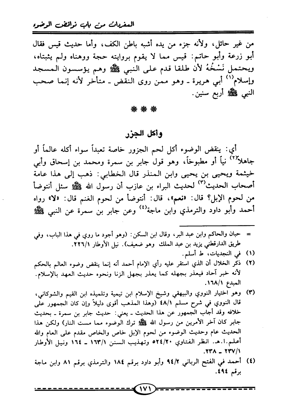 (¬3) وهو اختيار النووي والبيهقيُّ وشيخ الإِسلام ابن تيمية وتلميذه ابن القيم والشوكاني، قال النووي في شرح مسلم 1/ 48 (وهذا المذهب أقوى دليلًا وإن كان الجمهور على خلافه وقد أجاب الجمهور عن هذا الحديث -يعني: حديث جابر بن سمرة- بحديث جابر كان آخر الأمرين من رسول الله - صلى الله عليه وسلم - ترك الوضوء مما مست النار) ولكن هذا الحديث عام وحديث الوضوء من لحوم الإبل خاص والخاص مقدم على العام والله أعلم. أ. هـ. انظر الفتاوي 20/ 524 وتهذيب السنن 1/ 163 - 164 ونيل الأوطار 1/ 237 - 238.