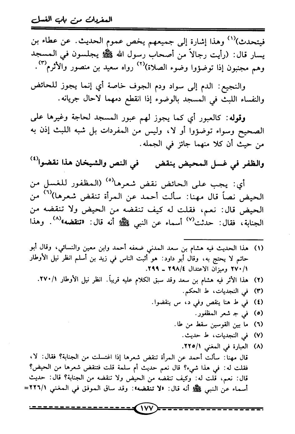 أي: يجب على الحائض نقض شعرها (¬5) (المظفور للغسل من الحيض نصًا قال مهنا: سألت أحمد عن المرأة تنقض شعرها) (¬6) من الحيض قال: نعم، فقلت له كيف تنقضه من الحيض ولا تنقضه من الجنابة، فقال: حدثت (¬7) أسماء عن النبي - صلى الله عليه وسلم - أنه قال: "تنقضه" (¬8). وهذا