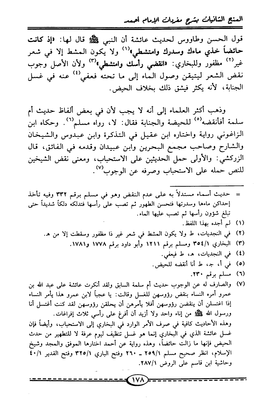 وهذه الأحاديث كافية في صرف الأمر الوارد في البخاري إلى الاستحباب، وأيضًا فإن غسل عائشة الذي في البخاري إنما هو غسل تنظيف ليوم عرفة لا للتطهير من حدث الحيض فإنها ما زالت حائضًا، وهذه رواية عن أحمد اختارها الموفق والمجد وشيخ الإسلام، انظر صحيح مسلم 1/ 259 - 260 وفتح الباري 1/ 325 وفتح القدير 1/ 40 وحاشية ابن قاسم على الروض 1/ 287.