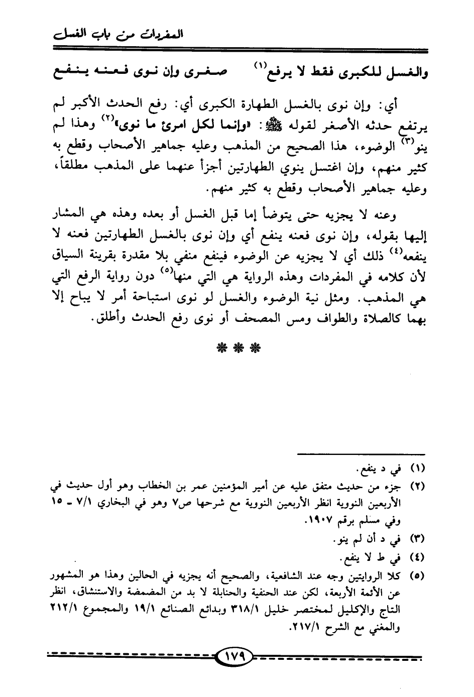 وعنه لا يجزيه حتى يتوضأ إما قبل الغسل أو بعده وهذه هي المشار إليها بقوله، وإن نوى فعنه ينفع أي وإن نوى بالغسل الطهارتين فعنه لا ينفعه (¬4) ذلك أي لا يجزيه عن الوضوء فينفع منفي بلا مقدرة بقرينة السياق لأن كلامه في المفردات وهذه الرواية هي التي منها (¬5) دون رواية الرفع التي هي المذهب. ومثل نية الوضوء والغسل لو نوى استباحة أمر لا يباح إلا بهما كالصلاة والطواف ومس المصحف أو نوى رفع الحدث وأطلق.