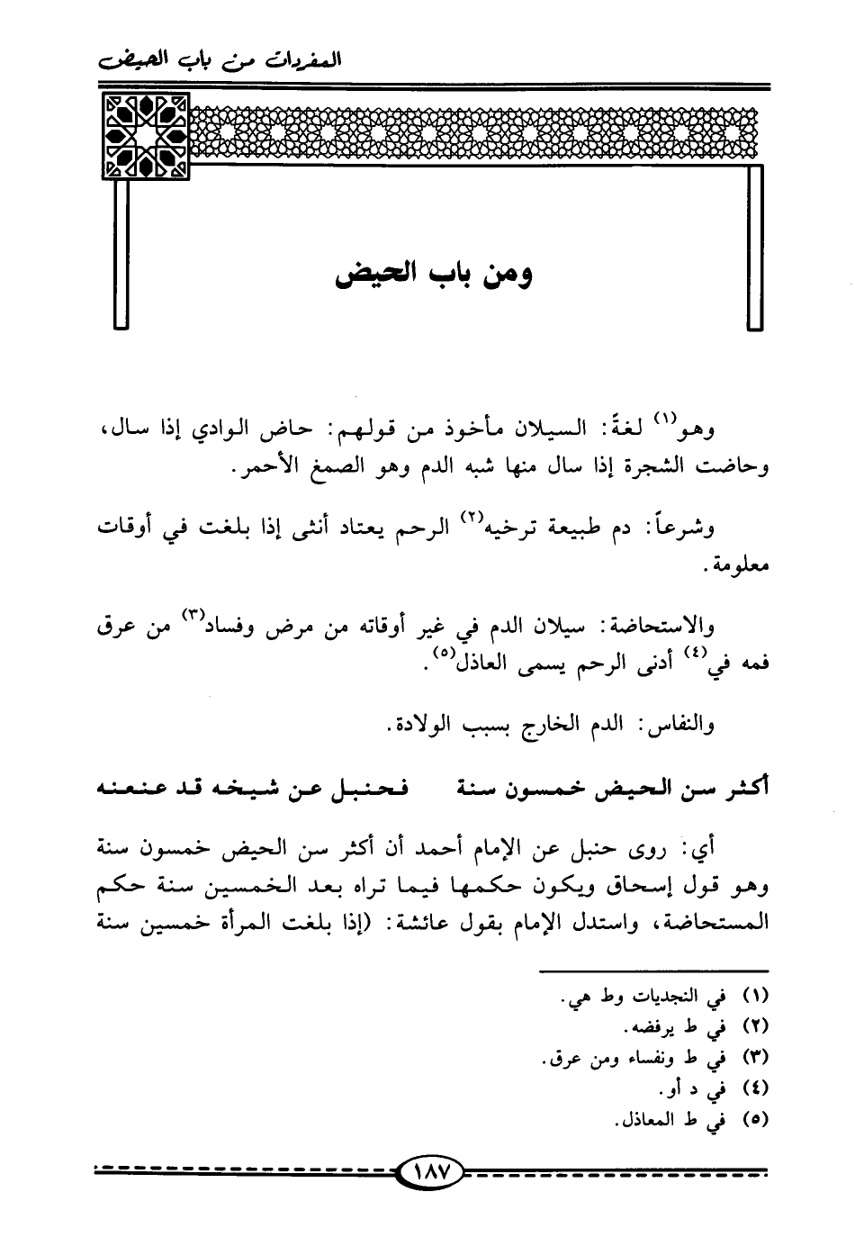 أي: روى حنبل عن الإمام أحمد أن أكثر سن الحيض خمسون سنة وهو قول إسحاق ويكون حكمها فيما تراه بعد الخمسين سنة حكم المستحاضة، واستدل الإمام بقول عائشة: (إذا بلغت المرأة خمسين سنة