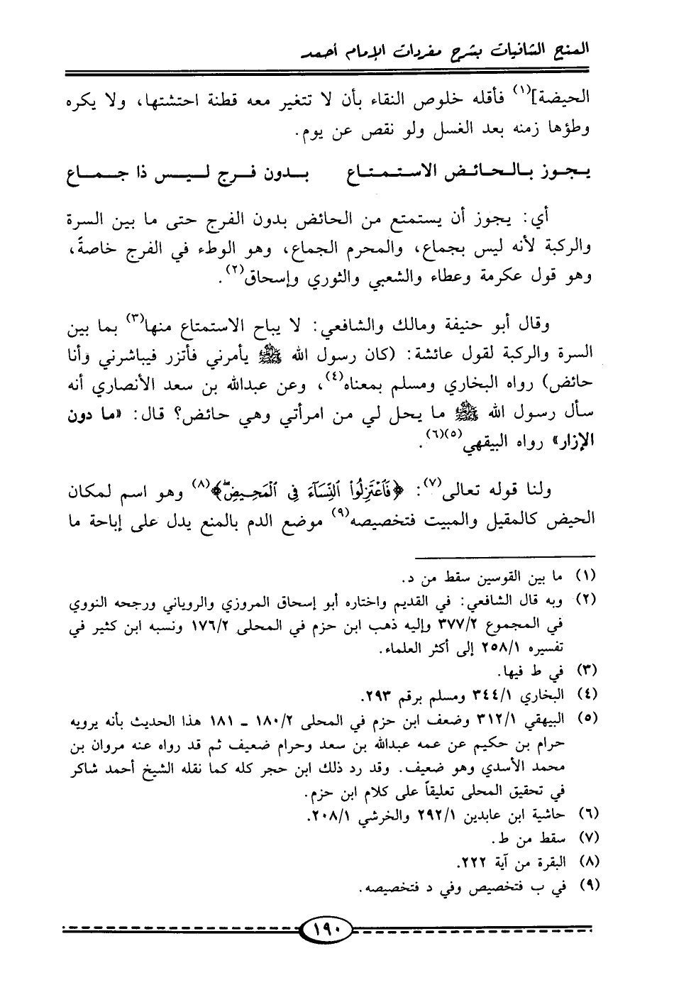وقال أبو حنيفة ومالك والشافعيُّ: لا يباح الاستمتاع منها (¬3) بما بين السرة والركبة لقول عائشة: (كان رسول الله - صلى الله عليه وسلم - يأمرني فأتزر فيباشرني وأنا حائض) رواه البخاري ومسلمٌ بمعناه (¬4)، وعن عبد الله بن سعد الأنصاري أنه سأل رسول الله - صلى الله عليه وسلم - ما يحل لي من امرأتي وهي حائض؟ قال: "ما دون الإزار" رواه البيقهي (¬5) (¬6).