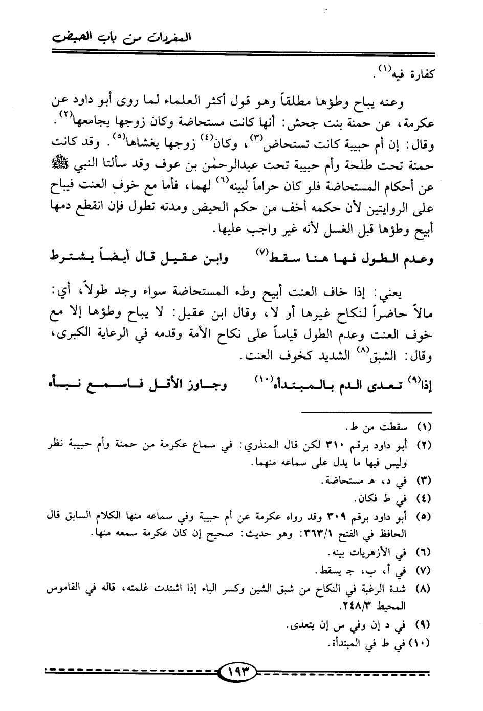 وعنه يباح وطؤها مطلقًا وهو قول أكثر العلماء لما روى أبو داود عن عكرمة، عن حمنة بنت جحش: أنها كانت مستحاضة وكان زوجها يجامعها (¬2). وقال: إن أم حبيبة كانت تستحاض (¬3)، وكان (¬4) زوجها يغشاها (¬5). وقد كانت حمنة تحت طلحة وأم حبيبة تحت عبد الرحمن بن عوف وقد سألتا النبي- صلى الله عليه وسلم - عن أحكام المستحاضة فلو كان حرامًا لبينه (¬6) لهما، فأما مع خوف العنت فيباح على الروايتين لأن حكمه أخف من حكم الحيض ومدته تطول فإن انقطع دمها أبيح وطؤها قبل الغسل لأنه غير واجب عليها.