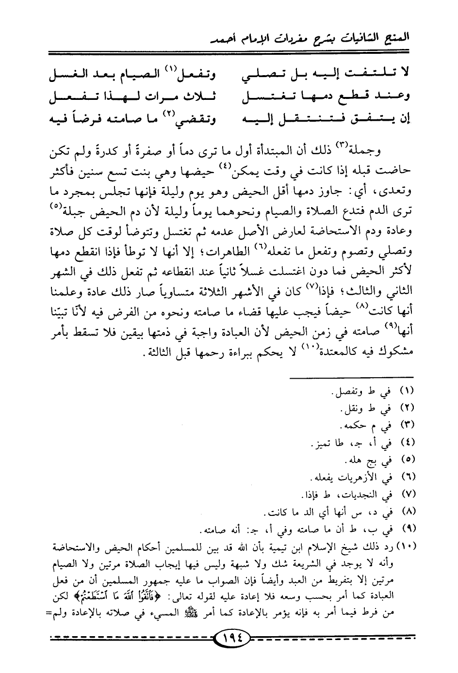 (¬10) رد ذلك شيخ الإسلام ابن تيمية بأن الله قد بين للمسلمين أحكام الحيض والاستحاضة وأنه لا يوجد في الشريعة شك ولا شبهة وليس فيها إيجاب الصلاة مرتين ولا الصيام مرتين إلا بتفريط من العبد وأيضًا فإن الصواب ما عليه جمهور المسلمين أن من فعل العبادة كما أمر بحسب وسعه فلا إعادة عليه لقوله تعالى: {فَاتَّقُوا اللَّهَ مَا اسْتَطَعْتُمْ} لكن من فرط فيما أمر به فإنه يؤمر بالإعادة كما أمر - صلى الله عليه وسلم - المسيء في صلاته بالإعادة ولم =