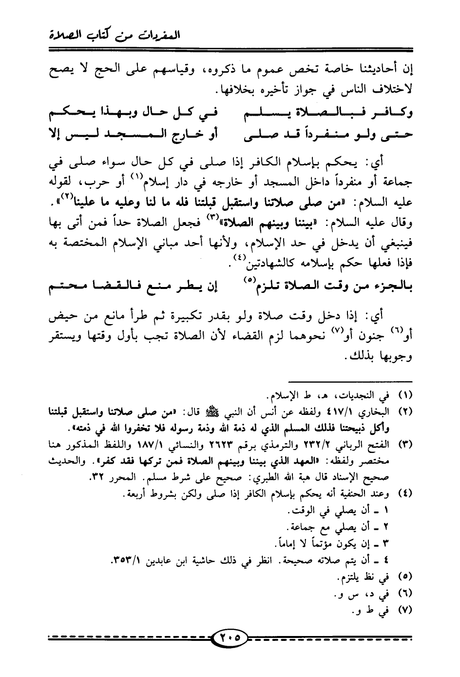 (¬4) وعند الحنفية أنه يحكم بإسلام الكافر إذا صلى ولكن بشروط أربعة.