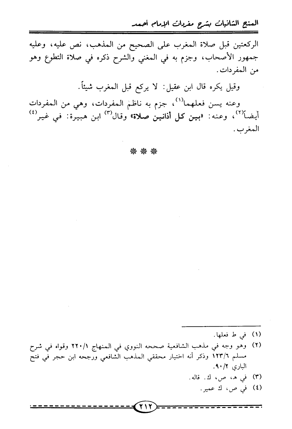 الركعتين قبل صلاة المغرب على الصحيح من المذهب، نص عليه، وعليه جمهور الأصحاب، وجزم به في المغني والشرح ذكره في صلاة التطوع وهو من المفردات.