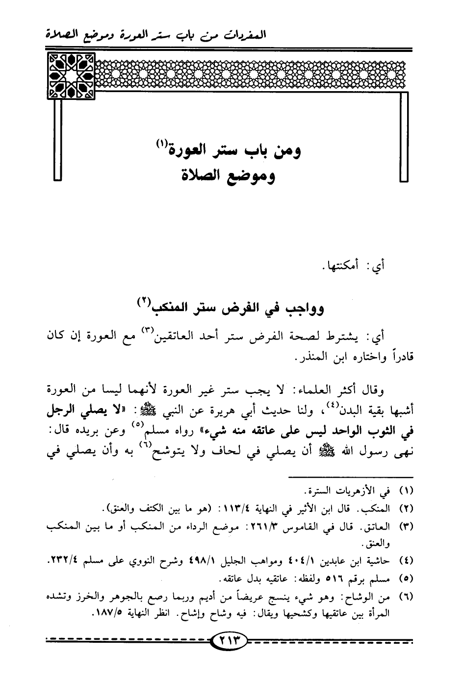 وقال أكثر العلماء: لا يجب ستر غير العورة لأنهما ليسا من العورة أشبها بقية البدن (¬4)، ولنا حديث أبي هريرة عن النبي - صلى الله عليه وسلم -: "لا يصلي الرجل في الثوب الواحد ليس على عاتقه منه شيء" رواه مسلم (¬5) وعن بريده قال: نهى رسول الله - صلى الله عليه وسلم - أن يصلي في لحاف ولا يتوشح (¬6) به وأن يصلي في