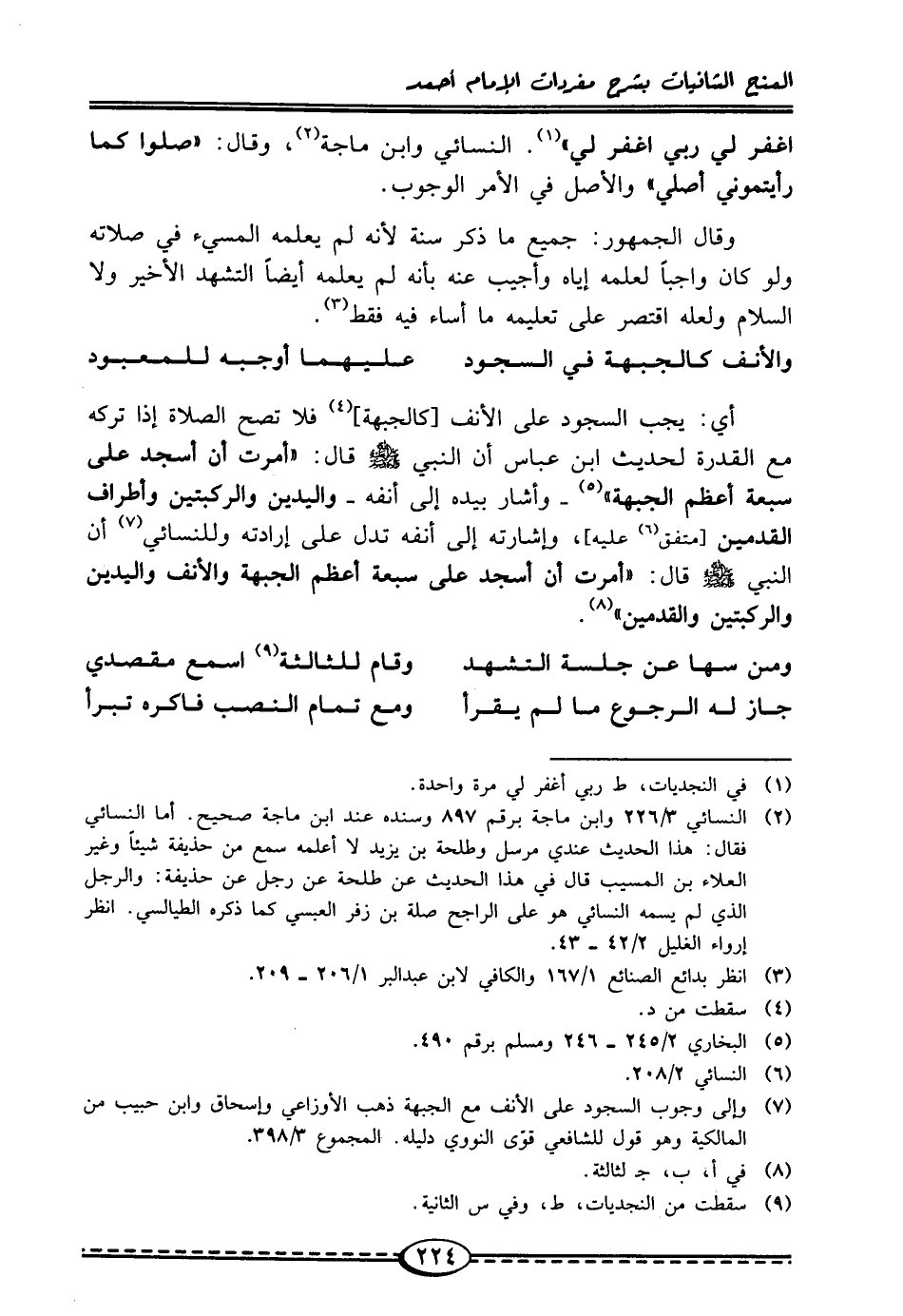 (¬7) وإلى وجوب السجود على الأنف مع الجبهة ذهب الأوزاعي وإسحاق وابن حبيب من المالكية وهو قول للشافعي قوّى النووي دليله. المجموع 3/ 398.
