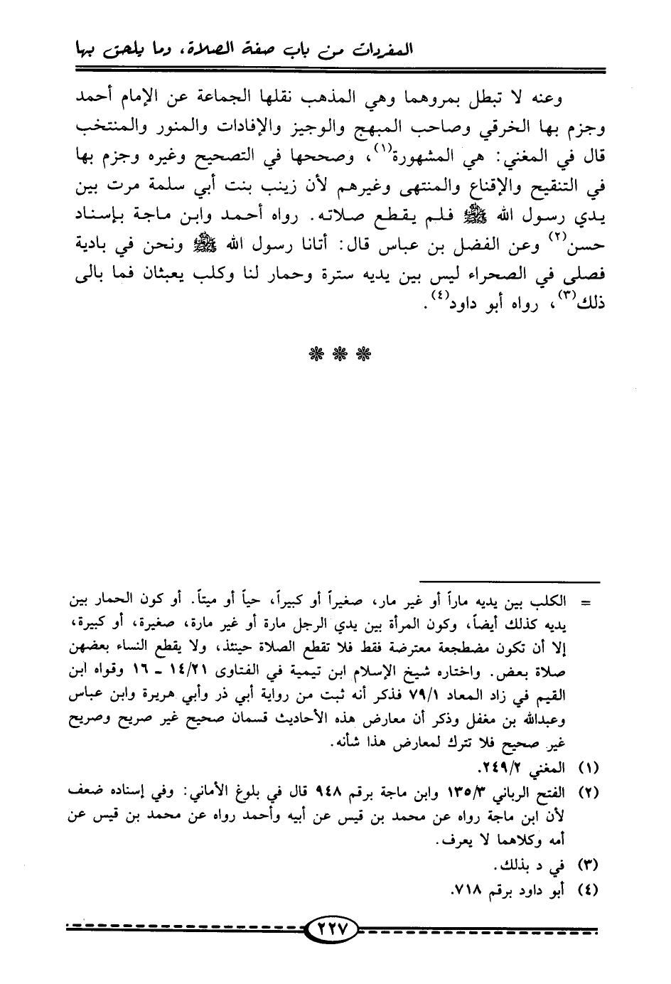 = الكلب بين يديه مارًا أو غير مار، صغيرًا أو كبيرًا، حيًا أو ميتًا. أو كون الحمار بين يديه كذلك أيضًا، وكون المرأة بين يدي الرجل مارة أو غير مارة، صغيرة، أو كبيرة، إلا أن تكون مضطجعة معترضة فقط فلا تقطع الصلاة حينئذ، ولا يقطع النساء بعضهن صلاة بعض. واختاره شيخ الإِسلام ابن تيمية في الفتاوى 21/ 14 - 16 وقواه ابن القيم في زاد المعاد 1/ 79 فذكر أنه ثبت من رواية أبي ذر وأبي هريرة وابن عباس وعبد الله بن مغفل وذكر أن معارض هذه الأحاديث قسمان صحيح غير صريح وصريح غير صحيح فلا تترك لمعارض هذا شأنه.