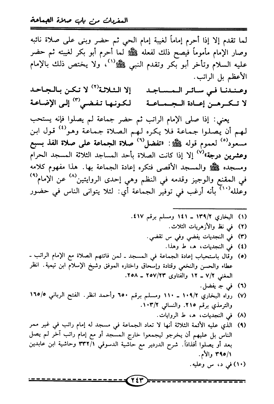 (¬9) الذي عليه الأئمة الثلاثة أنها لا تعاد الجماعة في مسجد له إمام راتب في غير ممر الناس بل عليهم أن يخرجو ليجمعوا خارج المسجد أو مع إمام راتب آخر لم يصل بعد أو يصلوا أفذاذًا. شرح الدردير مع حاشية الدسوقي 1/ 332 وحاشية ابن عابدين 1/ 395 والأم.