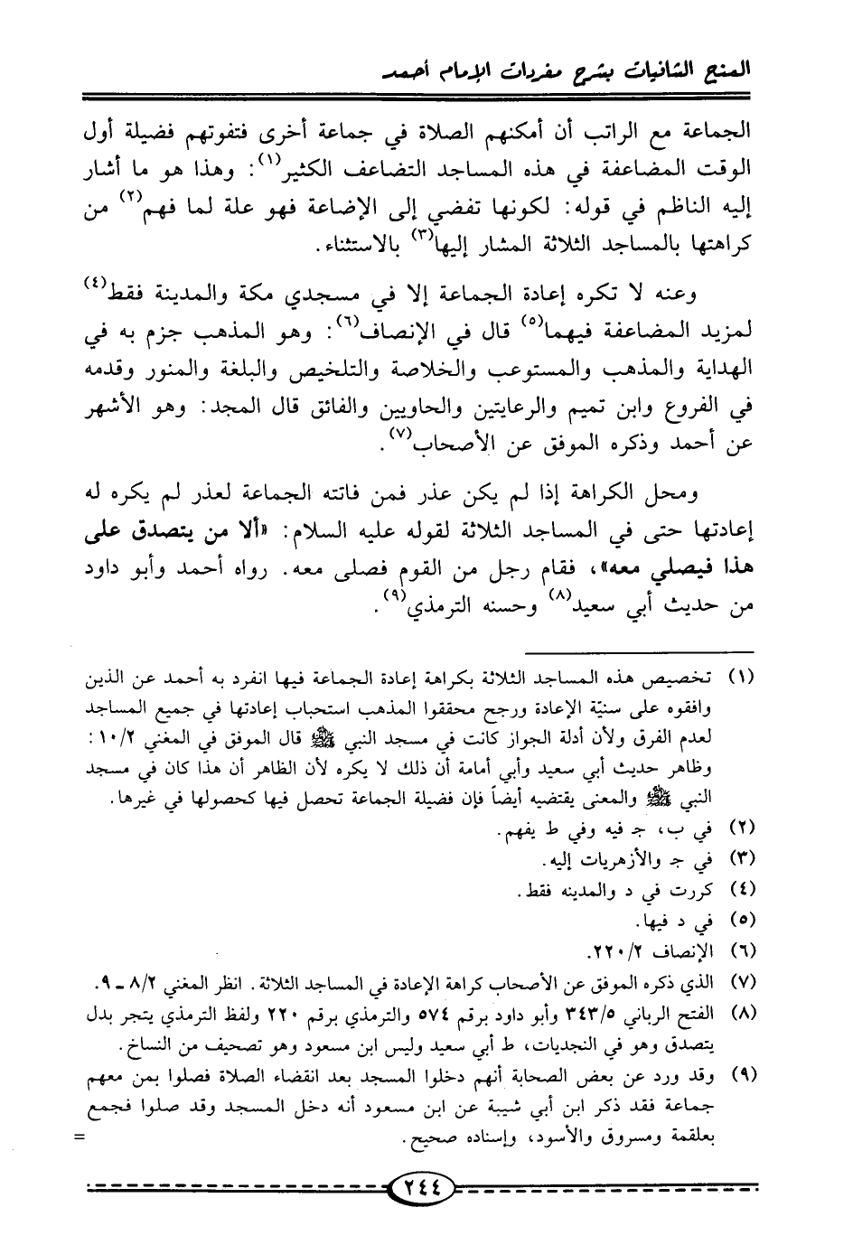 (¬1) تخصيص هذه المساجد الثلاثة بكراهة إعادة الجماعة فيها انفرد به أحمد عن الذين وافقوه على سنيّة الإعادة ورجح محققوا المذهب استحباب إعادتها في جميع المساجد لعدم الفرق ولأن أدلة الجواز كانت في مسجد النبي - صلى الله عليه وسلم - قال الموفق في المغني 2/ 10: وظاهر حديث أبي سعيد وأبي أمامة أن ذلك لا يكره لأن الظاهر أن هذا كان في مسجد النبي - صلى الله عليه وسلم - والمعنى يقتضيه أيضًا فإن فضيلة الجماعة تحصل فيها كحصولها في غيرها.