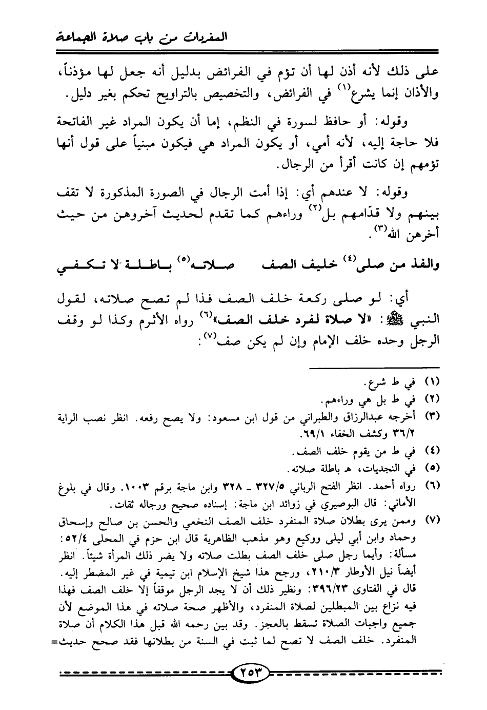 (¬7) وممن يرى بطلان صلاة المنفرد خلف الصف النخعي والحسن بن صالح وإسحاق وحماد وابن أبي ليلى ووكيع وهو مذهب الظاهرية قال ابن حزم في المحلى 4/ 52: مسألة: وأيما رجل صلى خلف الصف بطلت صلاته ولا يضر ذلك المرأة شيئًا. انظر أيضًا نيل الأوطار 3/ 210، ورجح هذا شيخ الإِسلام ابن تيمية في غير المضطر إليه. قال في الفتاوى 23/ 396: ونظير ذلك أن لا يجد الرجل موقفًا إلا خلف الصف فهذا فيه نزاع بين المبطلين لصلاة المنفرد، والأظهر صحة صلاته في هذا الموضع لأن جميع واجبات الصلاة تسقط بالعجز. وقد بين رحمه الله قبل هذا الكلام أن صلاة