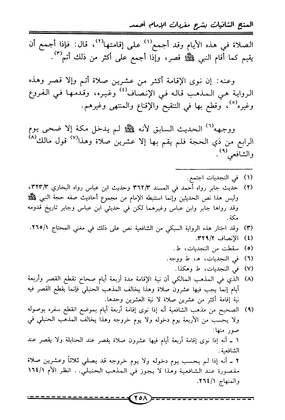 (¬8) الذي في المذهب المالكي أن نية الإقامة مدة أربعة أيام صحاح تقطع القصر وأربعة أيام إنما يجب فيها عشرون صلاة وهذا يخالف المذهب الحنبلي فإنما يقطع القصر فيه نية إقامة أكثر من عشرين صلاة لا نية العشرين وحدها.