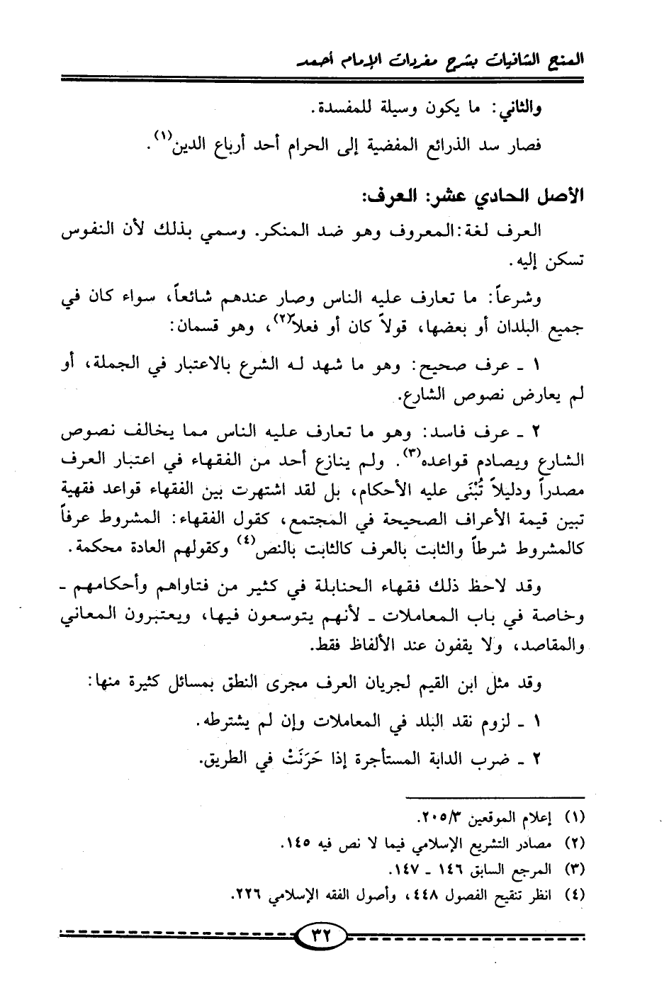 2 - عرف فاسد: وهو ما تعارف عليه الناس مما يخالف نصوص الشارع ويصادم قواعده (¬3). ولم ينازع أحد من الفقهاء في اعتبار العرف مصدرًا ودليلًا تُبْنَى عليه الأحكام، بل لقد اشتهرت بين الفقهاء قواعد فقهية تبيّن قيمة الأعراف الصحيحة في المجتمع، كقول الفقهاء: المشروط عرفًا كالمشروط شرطًا والثابت بالعرف كالثابت بالنص (¬4) وكقولهم العادة محكمة.
