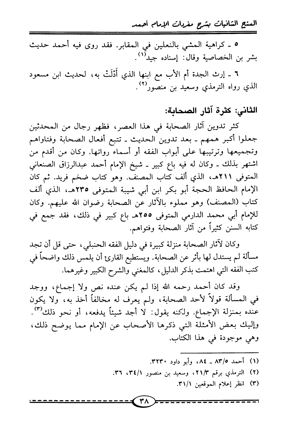 5 - كراهية المشي بالنعلين في المقابر. فقد روى فيه أحمد حديث بشر بن الخصاصية وقال: إسناده جيد (¬1).