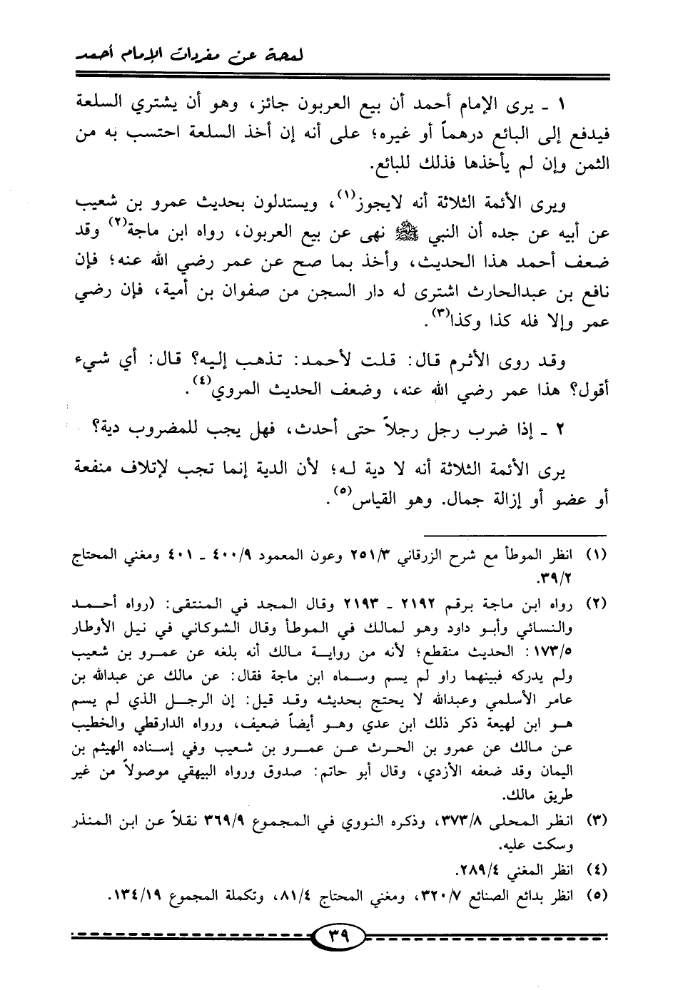 1 - يرى الإمام أحمد أن بيع العربون جائز، وهو أن يشتري السلعة فيدفع إلى البائع درهمًا أو غيره؛ على أنه إن أخذ السلعة احتسب به من الثمن وإن لم يأخذها فذلك للبائع.