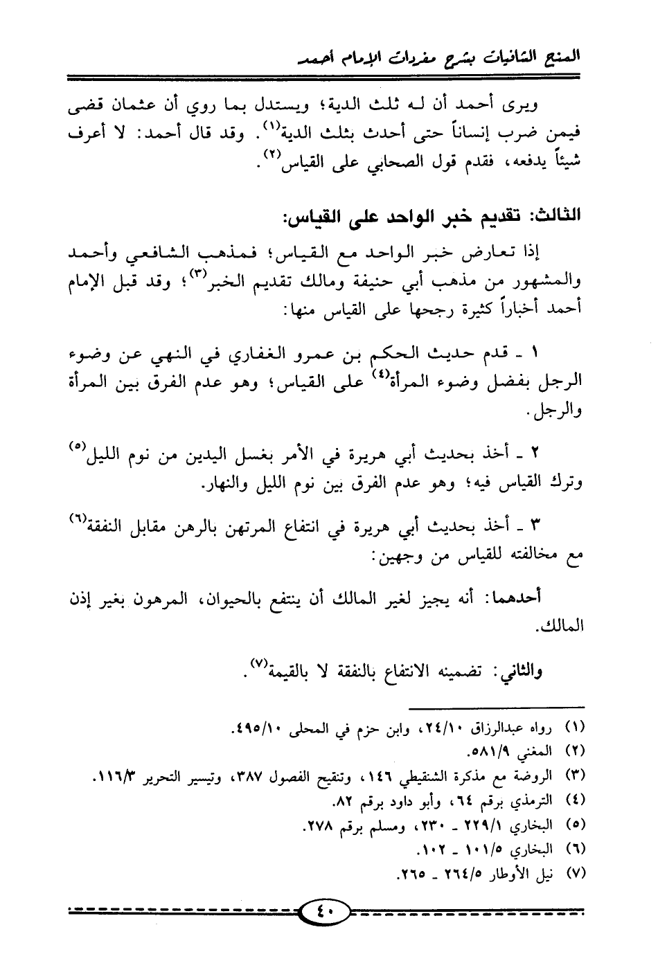 إذا تعارض خبر الواحد مع القياس؛ فمذهب الشافعي وأحمدُ والمشهور من مذهب أبي حنيفة ومالك تقديم الخبر (¬3)؛ وقد قبل الإمام أحمد أخبارًا كثيرة رجحها على القياس منها: