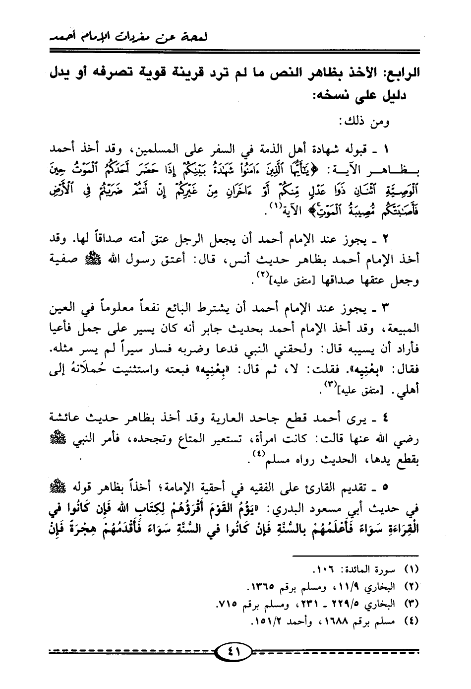 الرابع: الأخذ بظاهر النص ما لم ترد قرينة قوية تصرفه أو يدل دليل على نسخه: