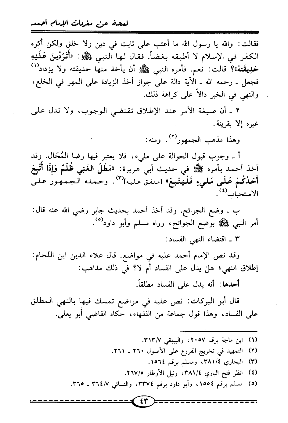 وقد نص الإمام أحمد عليه في مواضع. قال علاء الدين ابن اللحام: إطلاق النهي؛ هل يدل على الفساد أم لا؟ في ذلك مذاهب: