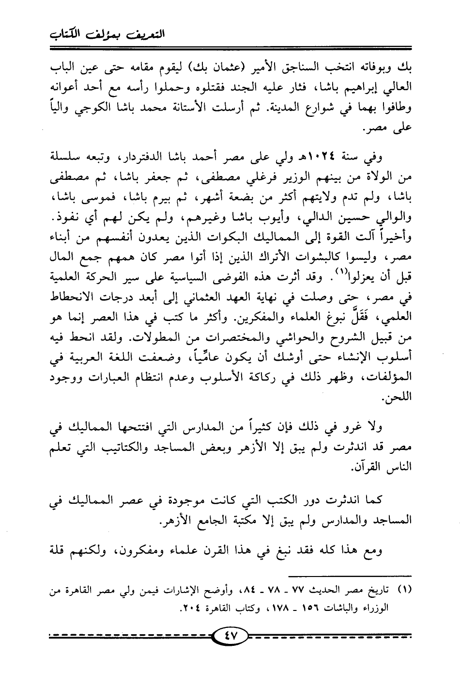 وفي سنة 1024 هـ ولي على مصر أحمد باشا الدفتردار، وتبعه سلسلة من الولاة من بينهم الوزير فرغلي مصطفى، ثم جعفر باشا، ثم مصطفى باشا، ولم تدم ولايتهم أكثر من بضعة أشهر، ثم بيرم باشا، فموسى باشا، والوالي حسين الدالي، وأيوب باشا وغيرهم، ولم يكن لهم أي نفوذ. وأخيرًا آلت القوة إلى المماليك البكوات الذين يعدون أنفسهم من أبناء مصر، وليسوا كالبشوات الأتراك الذين إذا أتوا مصر كان همهم جمع المال قبل أن يعزلوا (¬1). وقد أثرت هذه الفوضى السياسية على سير الحركة العلمية في مصر، حتى وصلت في نهاية العهد العثماني إلى أبعد درجات الانحطاط العلمي، فَقَلَّ نبوغ العلماء والمفكرين. وأكثر ما كتب في هذا العصر إنما هو من قبيل الشروح والحواشي والمختصرات من المطولات. ولقد انحط فيه أسلوب الإنشاء حتى أوشك أن يكون عامِّيًا، وضعفت اللغة العربية في المؤلفات، وظهر ذلك في ركاكة الأسلوب وعدم انتظام العبارات ووجود اللحن.