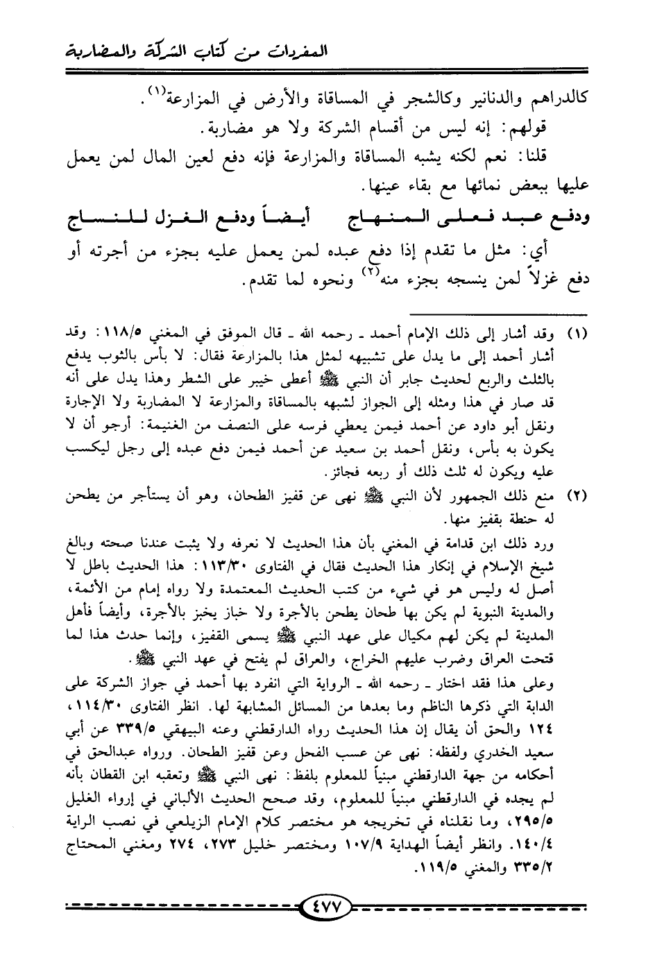 (¬1) وقد أشار إلى ذلك الأمام أحمد -رحمه الله- قال الموفق في المغني 5/ 118: وقد أشار أحمد إلى ما يدل على تشبيهه لمثل هذا بالمزارعة فقال: لا بأس بالثوب يدفع بالثلث والربع لحديث جابر أن النبي - صلى الله عليه وسلم - أعطى خيبر على الشطر وهذا يدل على أنه قد صار في هذا ومثله إلى الجواز لشبهه بالمساقاة والمزارعة لا المضاربة ولا الإجارة ونقل أبو داود عن أحمد فيمن يعطي فرسه على النصف من الغنيمة: أرجو أن لا يكون به بأس، ونقل أحمد بن سعيد عن أحمد فيمن دفع عبده إلى رجل ليكسب عليه ويكون له ثلث ذلك أو ربعه فجائز.