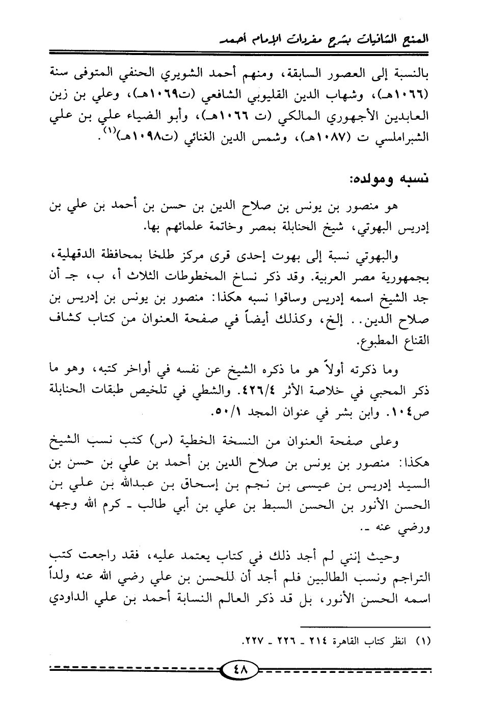 وعلى صفحة العنوان من النسخة الخطية (س) كتب نسب الشيخ هكذا: منصور بن يونس بن صلاح الدين بن أحمد بن علي بن حسن بن السيد إدريس بن عيسى بن نجم بن إسحاق بن عبد الله بن علي بن الحسن الأنور بن الحسن السبط بن علي بن أبي طالب -كرم الله وجهه ورضي عنه-.