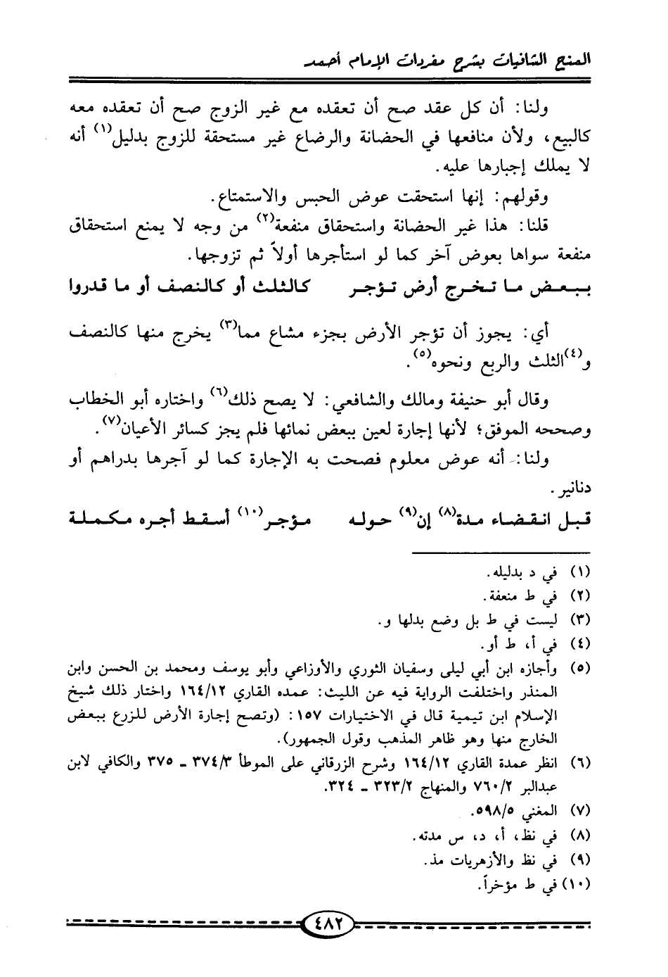 (¬5) وأجازه ابن أبي ليلى وسفيان الثوري والأوزاعي وأبو يوسف ومحمَّد بن الحسن وابن المنذر واختلفت الرواية فيه عن الليث: عمدة القاري 12/ 164 واختار ذلك شيخ الإسلام ابن تيمية قال في الاختيارات 157: (وتصح إجارة الأرض للزرع ببعض الخارج منها وهو ظاهر المذهب وقول الجمهور).