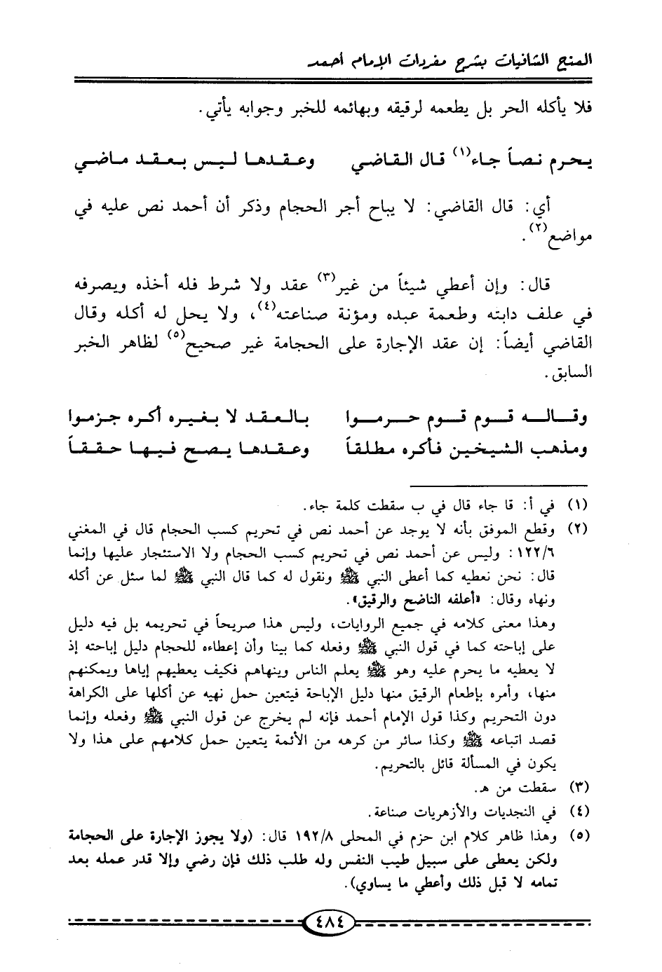 (¬2) وقطع المرفق بأنه لا يوجد عن أحمد نص في تحريم كسب الحجام قال في المغني 6/ 122: وليس عن أحمد نص في تحريم كسب الحجام ولا الاستئجار عليها وإنما قال: نحن نعطيه كما أعطى النبي - صلى الله عليه وسلم - ونقول له كما قال النبي - صلى الله عليه وسلم - لما سئل عن أكله ونهاه وقال: "أعلفه الناضح والرقيق".