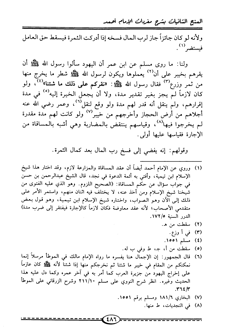 (¬1) وروي عن الإمام أحمد أيضًا أن عقد المساقاة والمزارعة لازم، وقد اختار هذا شيخ الإسلام ابن تيمية، وأفتي به أئمة الدعوة في نجد، قال الشيخ عبد الرحمن بن حسن في جواب سؤال عن حكم المساقاة: (الصحيح اللزوم. وهو الذي عليه الفتوى من شيخنا شيخ الإسلام ومن أخذ عنه، لا يختلف فيه اثنان منهم، واستمر الأمر على ذلك إلى الآن وهو الصواب، واختاره شيخ الإسلام ابن تيمية، وهو قول بعض متقدمي الأصحاب؛ لأنه عقد معاوضة فكان لازمًا كالإجارة فيفتقر إلى ضرب مدة) الدرر السنية 5/ 172.