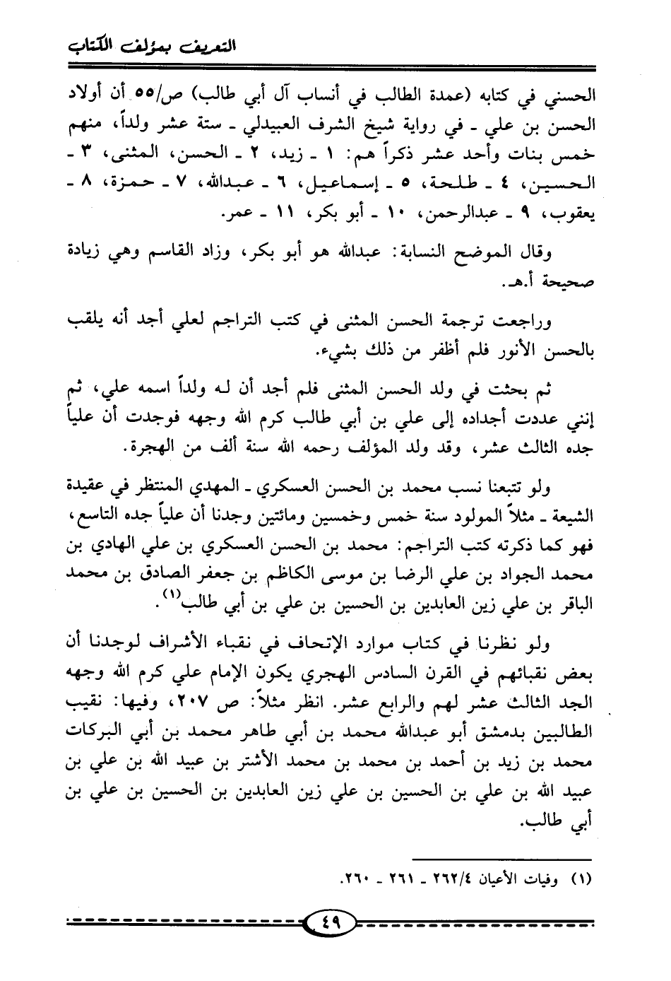 ولو نظرنا في كتاب موارد الإتحاف في نقباء الأشراف لوجدنا أن بعض نقبائهم في القرن السادس الهجري يكون الإمام علي كرم الله وجهه الجد الثالث عشر لهم والرابع عشر. انظر مثلًا: ص 207، وفيها: نقيب الطالبين بدمشق أبو عبد الله محمَّد بن أبي طاهر محمَّد بن أبي البركات محمَّد بن زيد بن أحمد بن محمَّد بن محمَّد الأشتر بن عبيد الله بن علي بن عبيد الله بن علي بن الحسين بن علي زين العابدين بن الحسين بن علي بن أبي طالب.