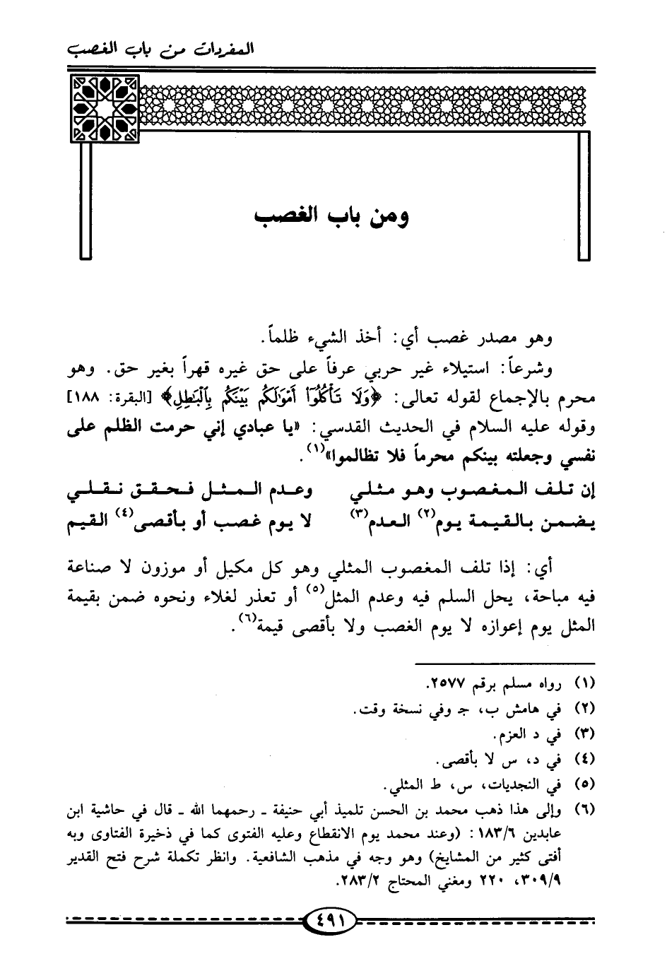 وشرعًا: استيلاء غير حربي عرفًا على حق غيره قهرًا بغير حق. وهو محرم بالإجماع لقوله تعالى: {وَلَا تَأْكُلُوا أَمْوَالَكُمْ بَيْنَكُمْ بِالْبَاطِلِ} [البقرة: 188] وقوله -عليه السلام- في الحديث القدسي: "يا عبادي إني حرمت الظلم على نفسي وجعلته بينكم محرمًا فلا تظالموا" (¬1).