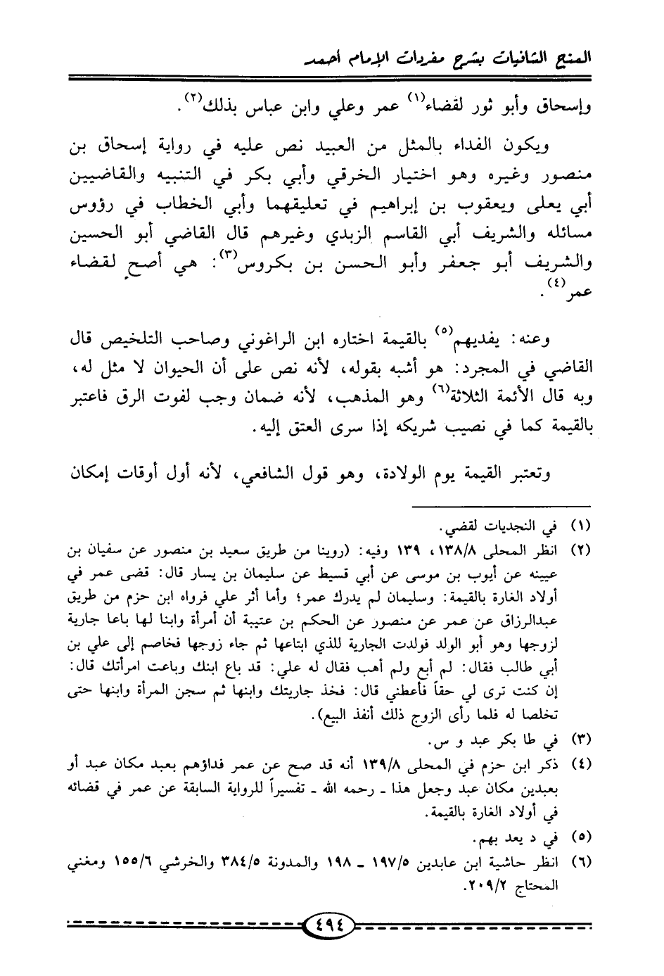 (¬4) ذكر ابن حزم في المحلى 8/ 139 أنه قد صح عن عمر فداؤهم بعبد مكان عبد أو بعبدين مكان عبد وجعل هذا -رحمه الله- تفسيرًا للرواية السابقة عن عمر في قضائه في أولاد الغارة بالقيمة.