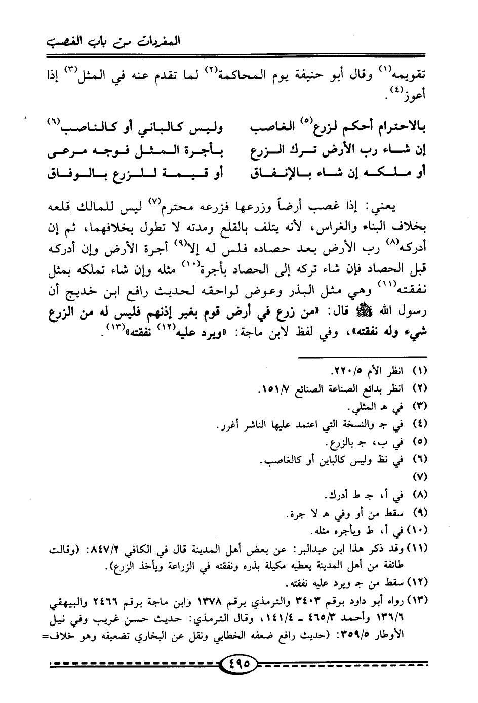 بالاحترام أحكم لزرع (¬5) الغاصب ... وليس كالباني أو كالناصب (¬6)
