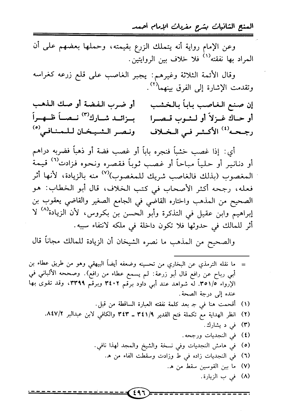 أي: إذا غصب خشبًا فنجره بابًا أو غصب فضة أو ذهبًا فضربه دراهم أو دنانير أو حليًا مباحًا أو غصب ثوبًا فقصره ونحوه فزادت (¬6) قيمة المغصوب (بذلك فالغاصب شريك للمغصوب) (¬7) منه بالزيادة، لأنها أثر فعله، رجحه أكثر الأصحاب في كتب الخلاف، قال أبو الخطاب: هو الصحيح من المذهب واختاره القاضي في الجامع الصغير والقاضي يعقوب بن إبراهيم وابن عقيل في التذكرة وأبو الحسن بن بكروس، لأن الزيادة (¬8) لا أثر للمالك في حدوثها فلا تكون داخلة في ملكه لانتفاء سببه.