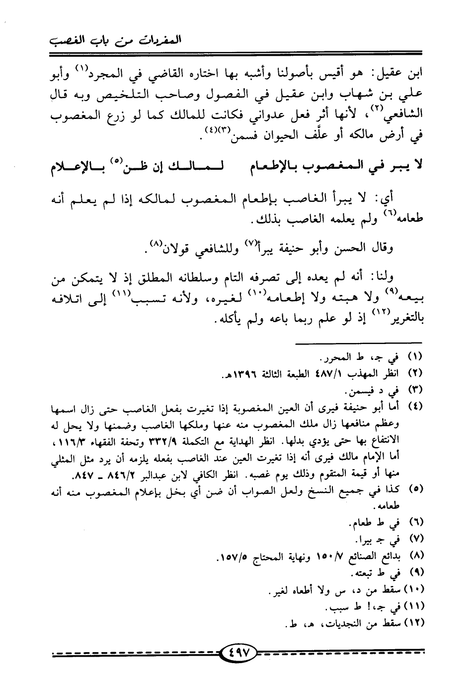 (¬4) أما أبو حنيفة فيرى أن العين المغصوبة إذا تغيرت بفعل الغاصب حتى زال اسمها وعظم منافعها زال ملك المغصوب منه عنها وملكها الغاصب وضمنها ولا يحل له الانتفاع بها حتى يؤدي بدلها. انظر الهداية مع التكملة 9/ 332 وتحفة الفقهاء 3/ 116، أما الإمام مالك فيرى أنه إذا تغيرت العين عند الغاصب بفعله يلزمه أن يرد مثل المثلي منها أو قيمة المتقوم وذلك يوم غصبه. انظر الكافي لابن عبد البر 2/ 846 - 847.
