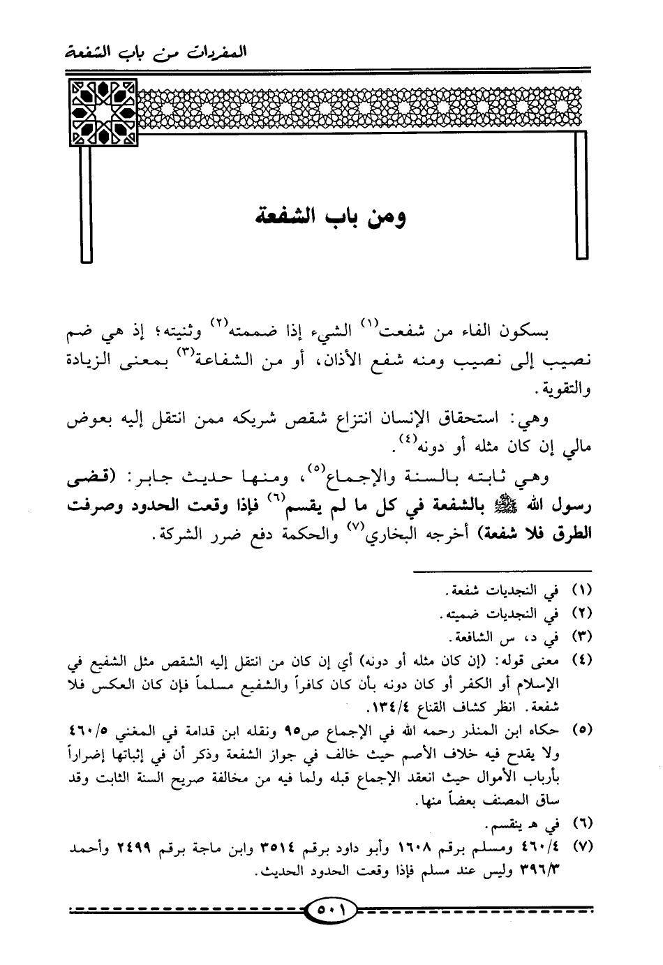 (¬7) 4/ 460 ومسلمٌ برقم 1608 وأبو داود برقم 3514 وابن ماجة برقم 2499 وأحمدُ 3/ 396 وليس عند مسلم فإذا وقعت الحدود الحديث.
