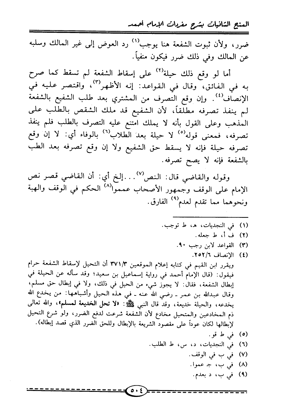 ويقرر ابن القيم في كتابه إعلام الموقعين 3/ 371 أن التحيل لإسقاط الشفعة حرام فيقول: (قال الإِمام أحمد في رواية إسماعيل بن سعيد. وقد سأله عن الحيلة في إبطال الشفعة، فقال: لا يجوز شيء من الحيل في ذلك، ولا في إبطال حق مسلم، وقال عبد الله بن عمر -رضي الله عنه- في هذه الحيل وأشباهها: من يخدع الله يخدعه، والحيلة خديعة، وقد قال النبي - صلى الله عليه وسلم -: "لا تحل الخديعة لمسلم" والله تعالى ذم المخادعين والمتحيل مخادع لأن الشفعة شرعت لدفع الضرر، ولو شرع التحيل لإبطالها لكان عودًا على مقصود الشريعة بالإبطال وللحق الضرر الذي قصد إبطاله).