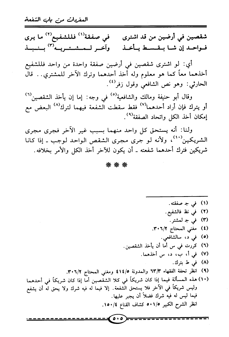 (¬10) هذه المسألة فيما إذا كان شريكًا في كلا الشقصين أما إذا كان شريكًا في أحدهما وليس شريكًا في الآخر فلا يستحق الشفعة. إلا فيما له فيه شرك ولا يحق له أن يشفع فيما ليس له فيه شرك فضلًا أن يجبر عليها.