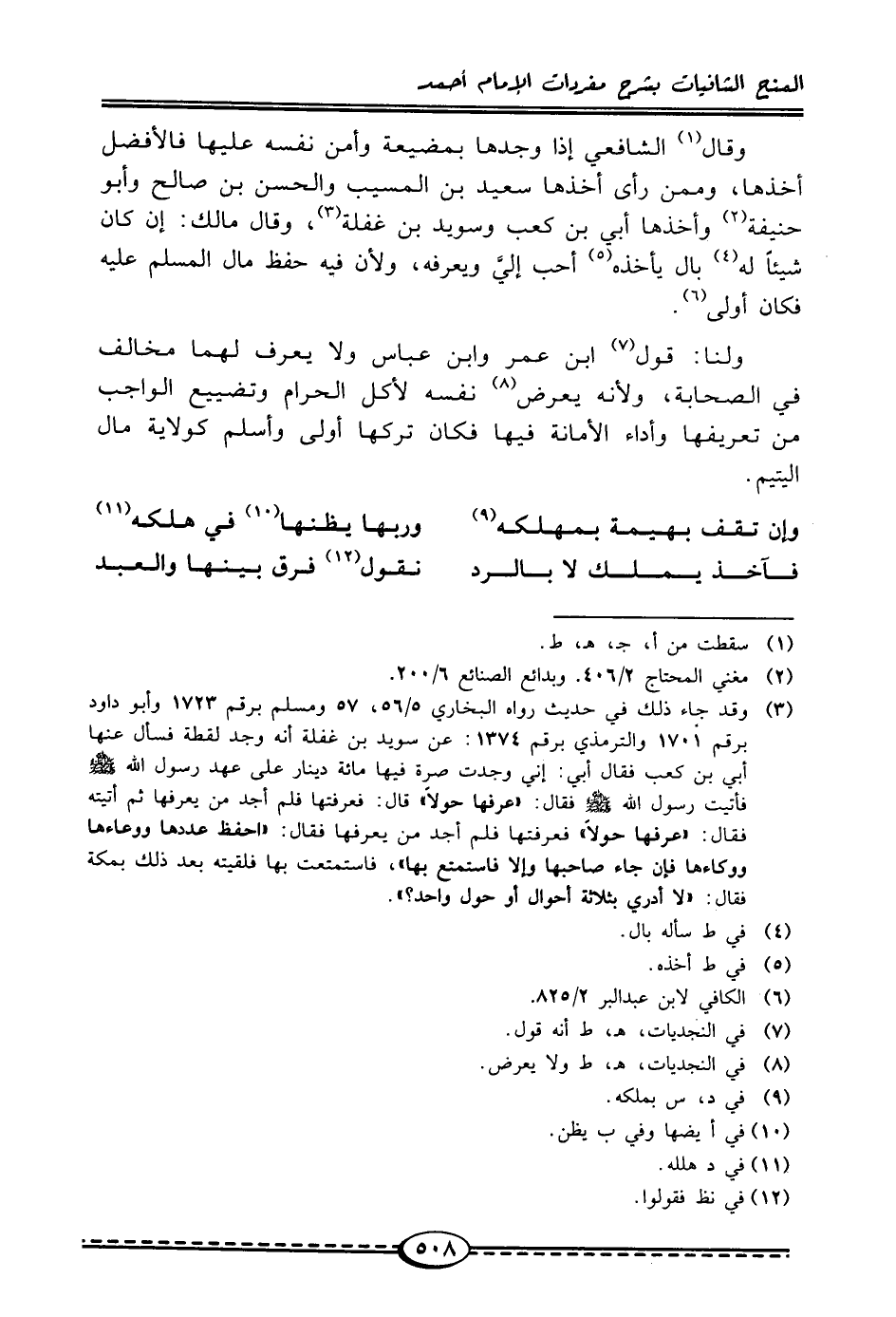 (¬3) وقد جاء ذلك في حديث رواه البخاري 5/ 56، 57 ومسلمٌ برقم 1723 وأبو داود برقم 1701 والترمذيُّ برقم 1374: عن سويد بن غفلة أنه وجد لقطة فسأل عنها أبي بن كعب فقال أبي: إني وجدت سورة فيها مائة دينار على عهد رسول الله - صلى الله عليه وسلم - فأتيت رسول الله - صلى الله عليه وسلم - فقال: "عرفها حولًا" قال: فعرفتها فلم أجد من يعرفها ثم أتيته فقال: "عرفها حولًا" فعرفتها فلم أجد من يعرفها فقال: "احفظ عددها ووعاءها ووكاءها فإن جاء صاحبها وإلا فاستمتع بها"، فاستمتعت بها فلقيته بعد ذلك بمكة فقال: "لا أدري بثلاثة أحوال أو حول واحد؟ ".