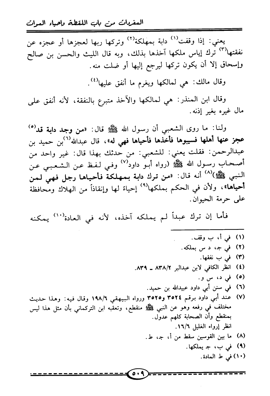 ولنا: ما روى الشعبي أن رسول الله - صلى الله عليه وسلم - قال: "من وجد دابة قد (¬5) عجز عنها أهلها فسيبوها فأخذها فأحياها فهي له"، قال عبد الله (¬6) بن حميد بن عبد الرحمن: فقلت يعني: للشعبي: من حدثك بهذا قال: غير واحد من أصحاب رسول الله - صلى الله عليه وسلم - (رواه أبو داود (¬7) وفي لفظ عن الشعبي عن النبي - صلى الله عليه وسلم - (¬8) أنه قال: "من ترك دابة بمهلكة فأحياها رجل فهي لمن أحياها"، ولأن في الحكم بملكها (¬9) إحياءً لها وإنقاذًا من الهلاك ومحافظة على حرمة الحيوان.