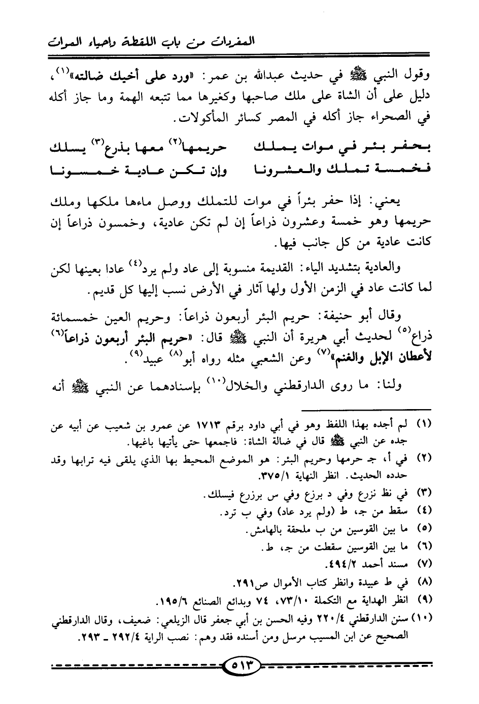 (¬2) في أ، جـ حرمها وحريم البئر: هو الموضع المحيط بها الذي يلقى فيه ترابها وقد حدده الحديث. انظر النهاية 1/ 375.