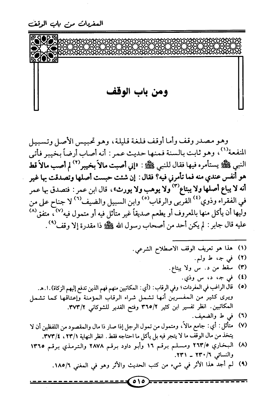 وهو مصدر وقف وأما أوقف فلغة قليلة، وهو تحبيس الأصل وتسبيل المنفعة (¬1)، وهو ثابت بالسنة فمنها حديث عمر: أنه أصاب أرضًا بخيبر فأتى النبي - صلى الله عليه وسلم - يستأمره فيها فقال للنبي - صلى الله عليه وسلم -: "إني أصبت مالًا بخيبر (¬2) لم أصب مالًا قط هو أنفس عندي منه فما تأمرني فيه؟ فقال: إن شئت حبست أصلها وتصدقت بها غير أنه لا يباع أصلها ولا يبتاع (¬3) ولا يوهب ولا يورث"، قال ابن عمر: فتصدق بها عمر في الفقراء وذوي (¬4) القربى والرقاب (¬5) وابن السبيل والضيف (¬6) لا جناح على من وليها أن يأكل منها بالمعروف أو يطعم صديقًا غير متأثل فيه أو متمول فيه (¬7)، متفق (¬8) عليه قال جابر: لم يكن أحد من أصحاب رسول الله - صلى الله عليه وسلم - ذا مقدرة إلا وقف (¬9).
