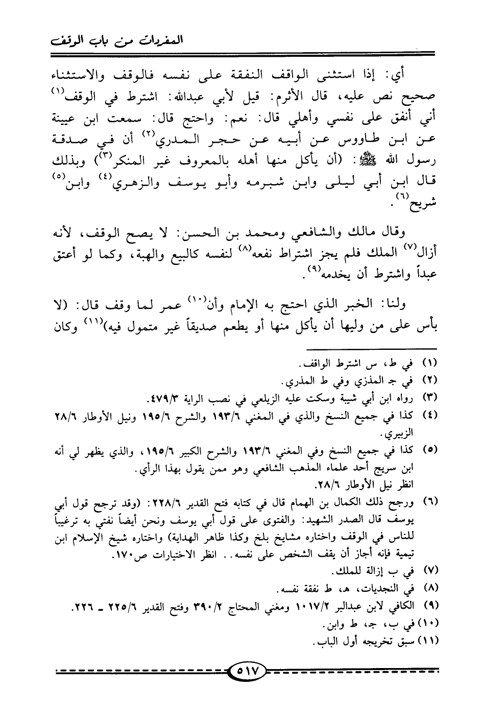 (¬6) ورجح ذلك الكمال بن الهمام قال في كتابه فتح القدير 6/ 228: (وقد ترجح قول أبي يوسف قال الصدر الشهيد: والفتوى على قول أبي يوسف ونحن أيضًا نفتي به ترغيبًا للناس في الوقف واختاره مشايخ بلخ وكذا ظاهر الهداية) واختاره شيخ الإِسلام ابن تيمية فإنه أجاز أن يقف الشخص على نفسه .. انظر الاختيارات صـ170.