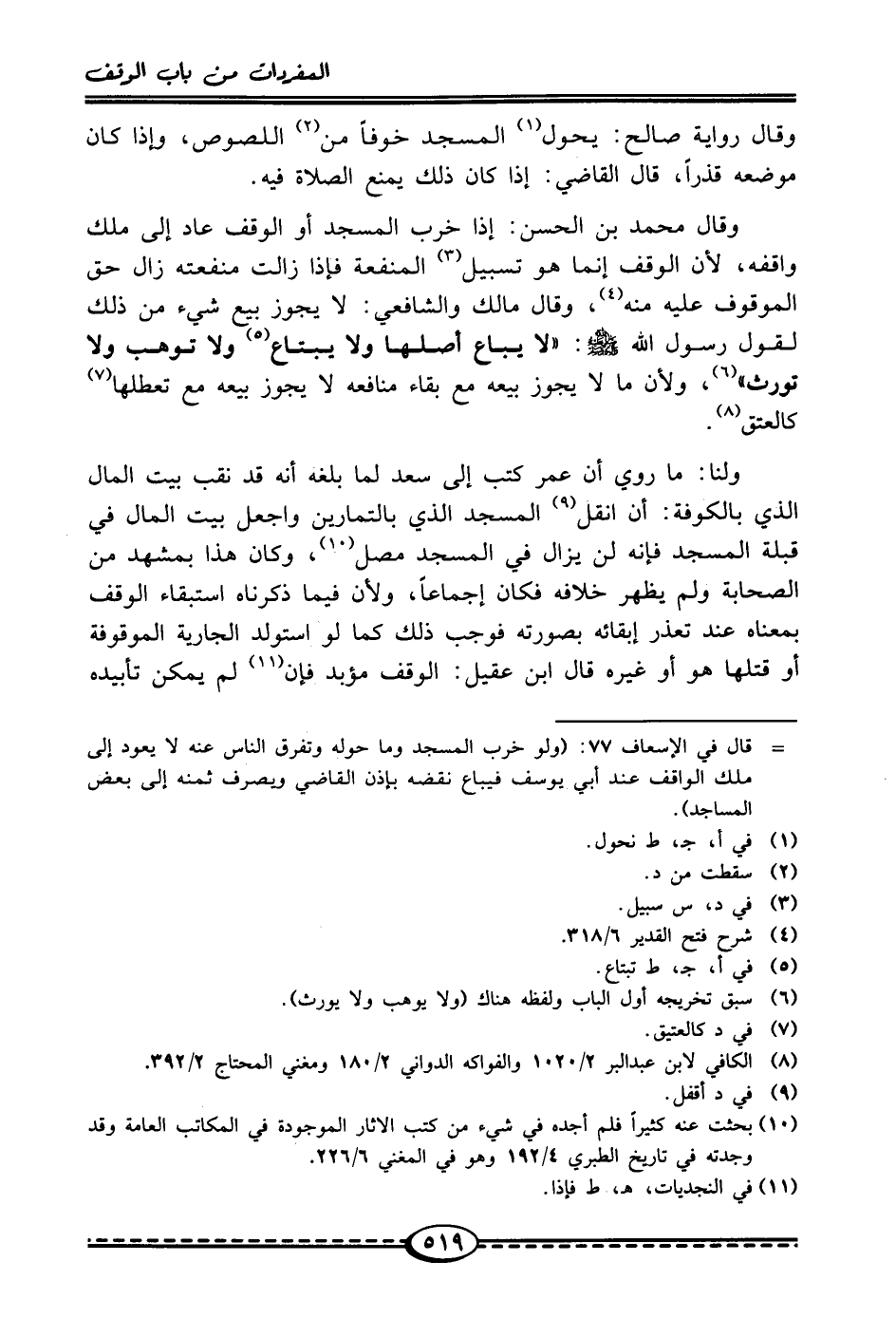 = قال في الإسعاف 77: (ولو خرب المسجد وما حوله وتفرق الناس عنه لا يعود إلى ملك الواقف عند أبي يوسف فيباع نقضه بإذن القاضي ويصرف ثمنه إلى بعض المساجد).