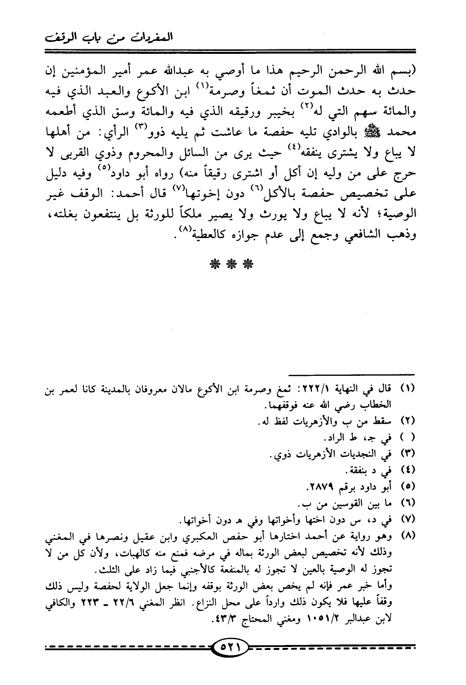 (بسم الله الرحمن الرحيم هذا ما أوصي به عبد الله عمر أمير المؤمنين إن حدث به حدث الموت أن ثمغًا وصرمة (¬1) ابن الأكوع والعبد الذي فيه والمائة سهم التي له (¬2) بخيبر ورقيقه الذي فيه والمائة وسق الذي أطعمه محمَّد - صلى الله عليه وسلم - بالوادي تليه حفصة ما عاشت ثم يليه ذوو (¬3) الرأي: من أهلها لا يباع ولا يشترى ينفقه (¬4) حيث يرى من السائل والمحروم وذوي القربى لا حرج على من وليه إن أكل أو اشترى رقيقًا منه) رواه أبو داود (¬5) وفيه دليل على تخصيص حفصة بالأكل (¬6) دون إخوتها (¬7) قال أحمد: الوقف غير الوصية؛ لأنه لا يباع ولا يورث ولا يصير ملكًا للورثة بل ينتفعون بغلته، وذهب الشافعي وجمع إلى عدم جوازه كالعطية (¬8).