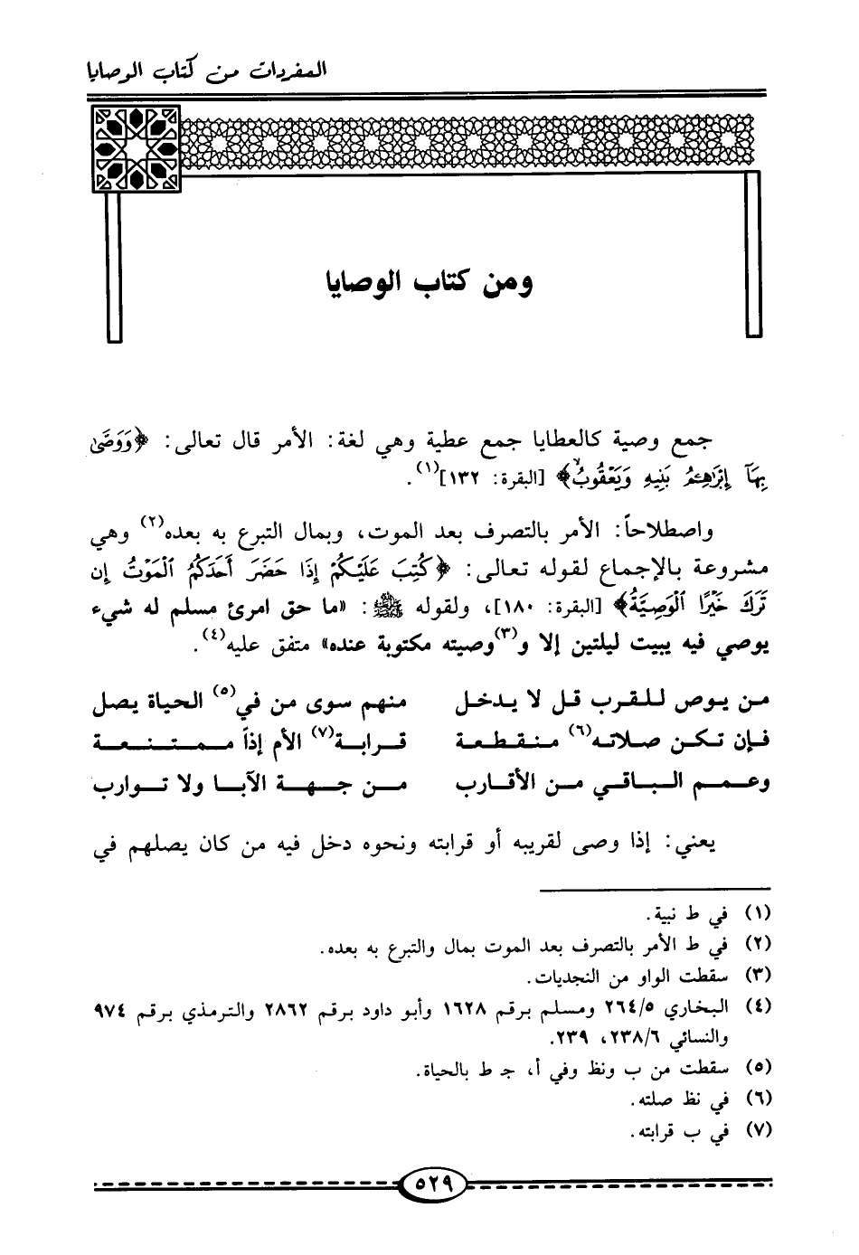 واصطلاحًا: الأمر بالتصرف بعد الموت، وبمال التبرع به بعده (¬2) وهي مشروعة بالإجماع لقوله تعالى: {كُتِبَ عَلَيْكُمْ إِذَا حَضَرَ أَحَدَكُمُ الْمَوْتُ إِنْ تَرَكَ خَيْرًا الْوَصِيَّةُ} [البقرة: 180]، ولقوله - صلى الله عليه وسلم -: "ما حق امرئ مسلم له شيء يوصي فيه يبيت ليلتين إلا و (¬3) وصيته مكتوبة عنده" متفق عليه (¬4).
