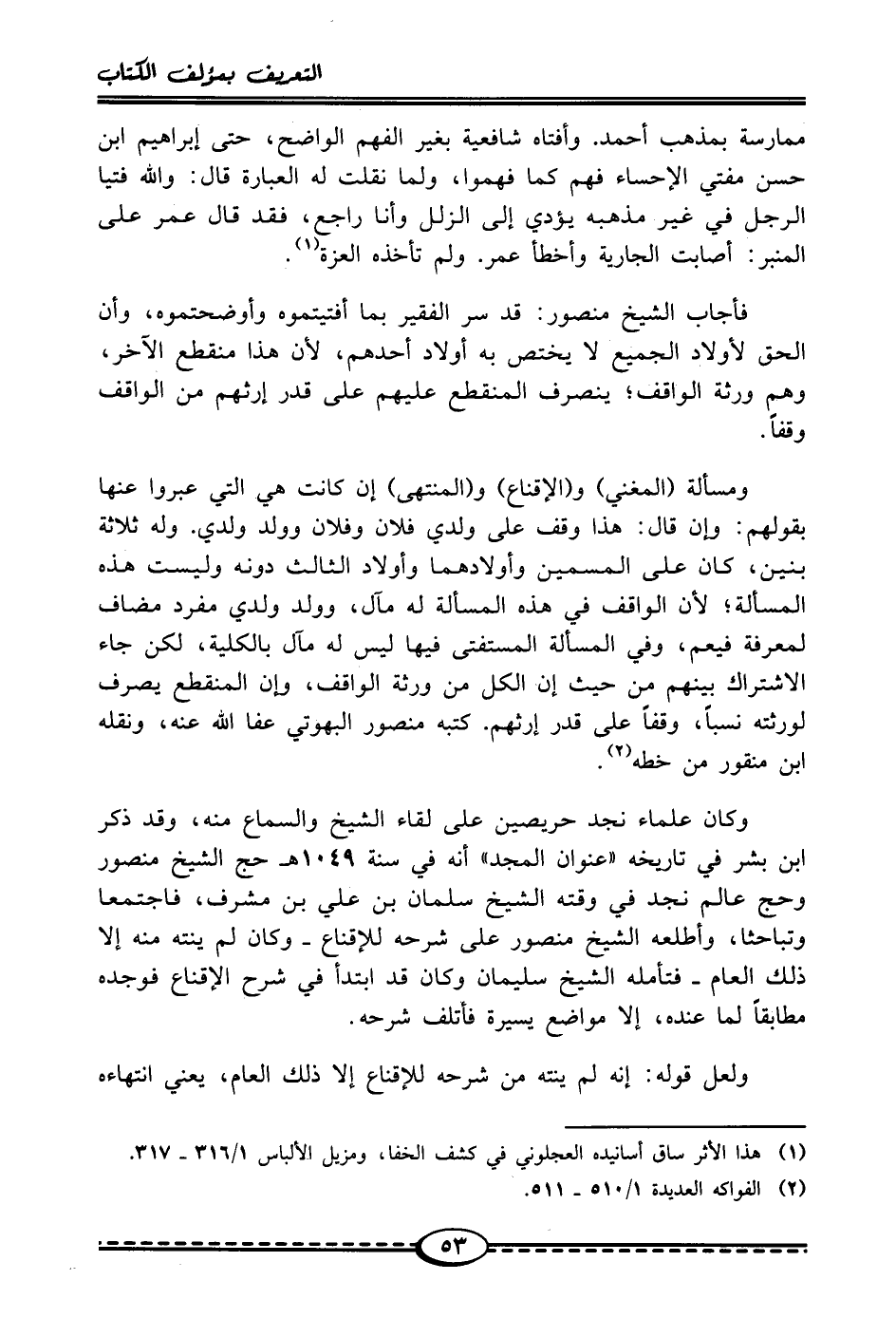 ومسألة (المغني) و (الإقناع) و (المنتهى) إن كانت هي التي عبروا عنها بقولهم: وإن قال: هذا وقف على ولدي فلان وفلان وولد ولدي. وله ثلاثة بنين، كان على المسمين وأولادهما وأولاد الثالث دونه وليست هذه المسألة؛ لأنّ الواقف في هذه المسألة له مآل، وولد ولدي مفرد مضاف لمعرفة فيعم، وفي المسألة المستفتى فيها ليس له مآل بالكلية، لكن جاء الاشتراك بينهم من حيث إن الكل من ورثة الواقف، وإن المنقطع يصرف لورثته نسبًا، وقفًا على قدر إرثهم. كتبه منصور البهوتي عفا الله عنه، ونقله ابن منقور من خطه (¬2).